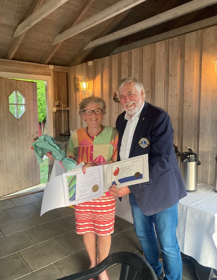 Derfor er det som seg hør og bør at hun under sommermøtet til LC Tønsberg i år, ble tildelt både Lionsfakkelen og den internasjonale presidenten – Brian Sheenans -Certificate of appreciation.